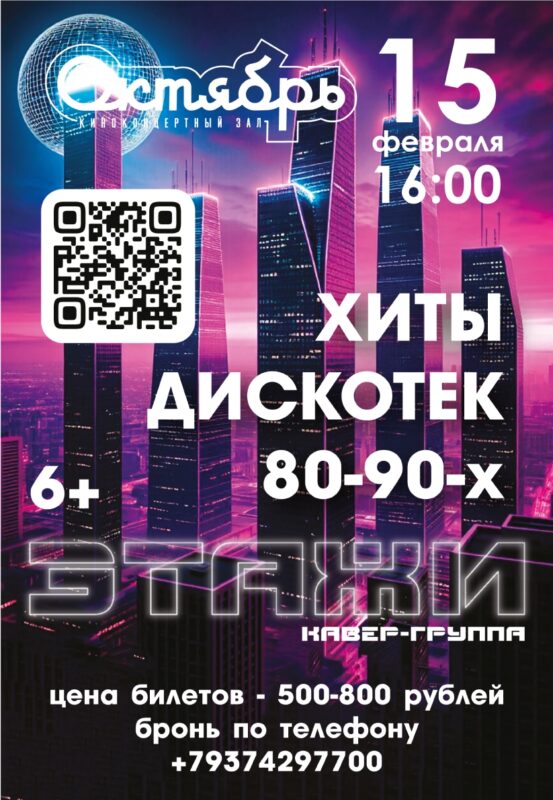 Приглашаем вас на концерт кавер-группы "Этажи" с программой "Дискотека 80-90хх. цена билетов 500-800 рублей